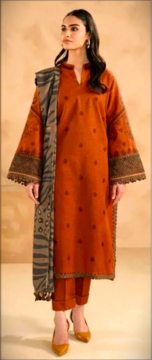 Experience elegance and winter comfort with this premium embroidered Dhanak 3-piece suit, designed with refined detailing and warm fabric suitable for the season. The embroidered front adds a graceful touch, paired with dyed Dhanak sleeves and a beautifully digital printed wool shawl that enhances the overall look. A dyed Dhanak trouser completes the outfit, making it a perfect choice for everyday wear, gatherings, and winter styling.