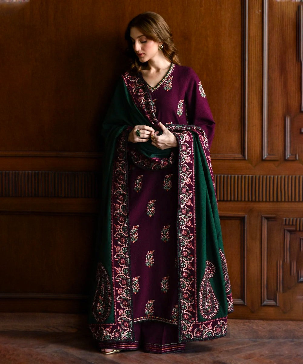 Luxury Winter Collection: Forest Green Embroidered Dhanak 3PC Suit with Printed Wool Shawl â 471